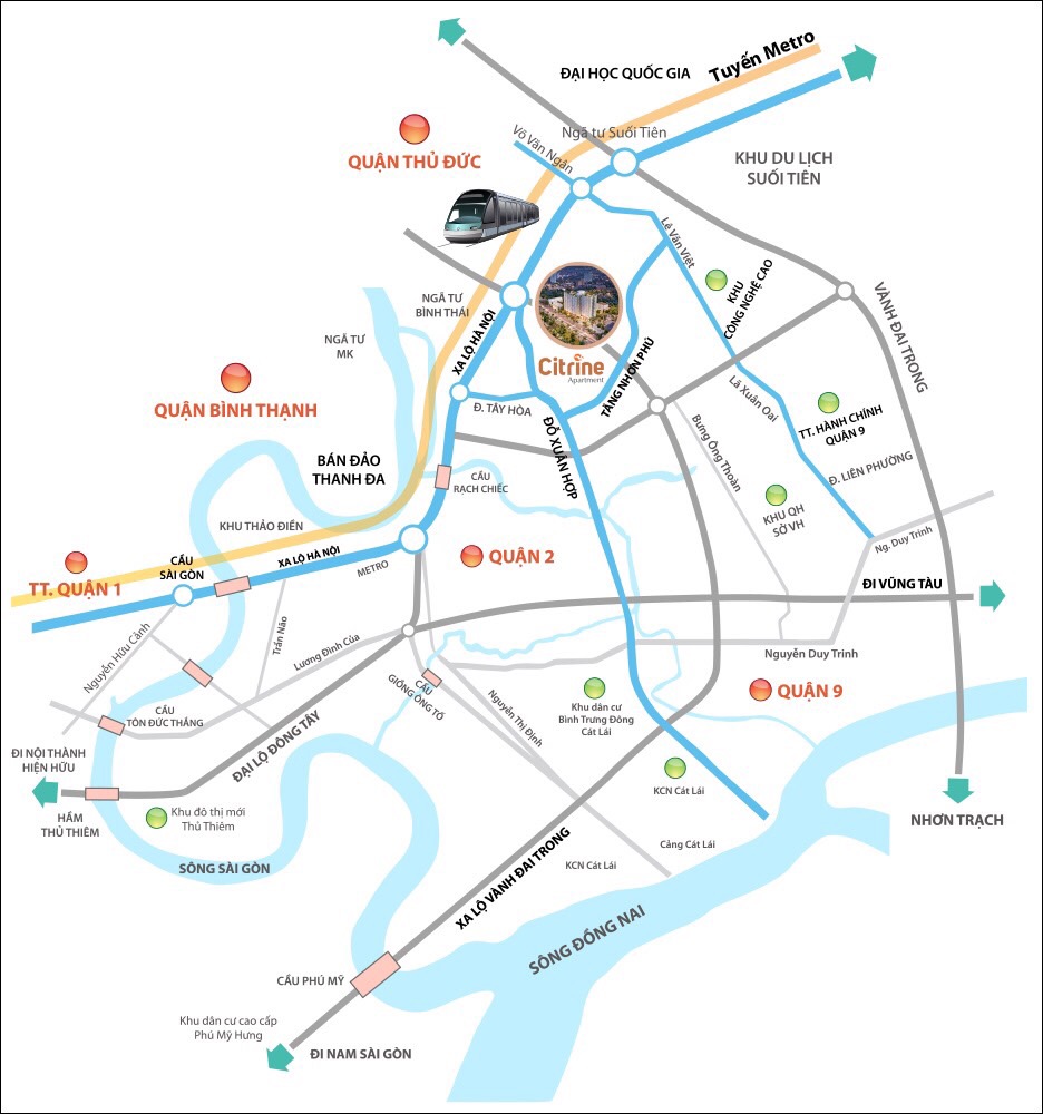 Citrine Apartment tọa lạc ngay mặt tiền đường Tăng Nhơn Phú, phường Phước Long B, quận 9, TP.HCM với khu dân cư sầm uất, đối diện là khu phức hợp Phước Long Spring Town 3,7 ha (được Thuduc House đầu tư phát triển và bàn giao cho cư dân từ năm 2014), ngay cạnh Trường CĐ Công Thương TP.HCM, chỉ cách ga Bình Thái của tuyến Metro Bến Thành - Suối Tiên khoảng 500 m. Từ vị trí dự án Citrine Apartment Tăng Nhơn Phú khách hàng dễ dàng di chuyển đến các khu vực trung tâm và những tiện ích hiện hữu lân cận. Trở thành cư dân Citrine Apartment, bạn và gia đình sẽ được thừa hưởng mọi tiện ích và thời gian tiếp cận chỉ là khoảnh khắc.